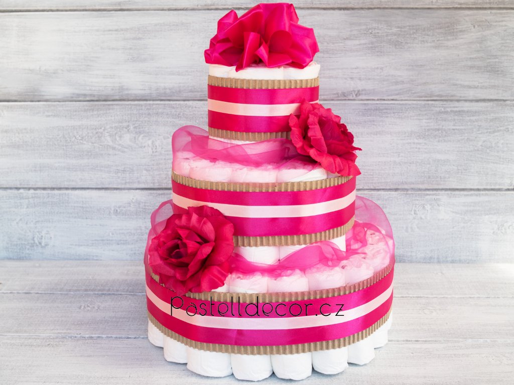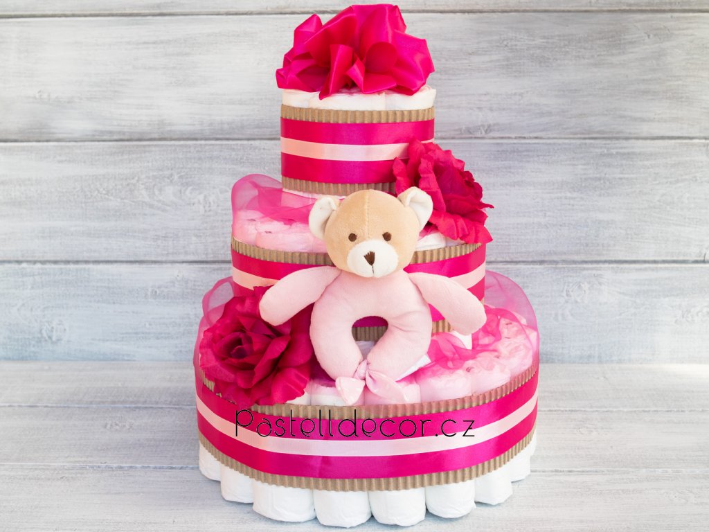 Třípatrový plenkový dort pro holčičku v malinové barvě. Praktický dárek k narození miminka, možno zakoupit s hračkou i bez.